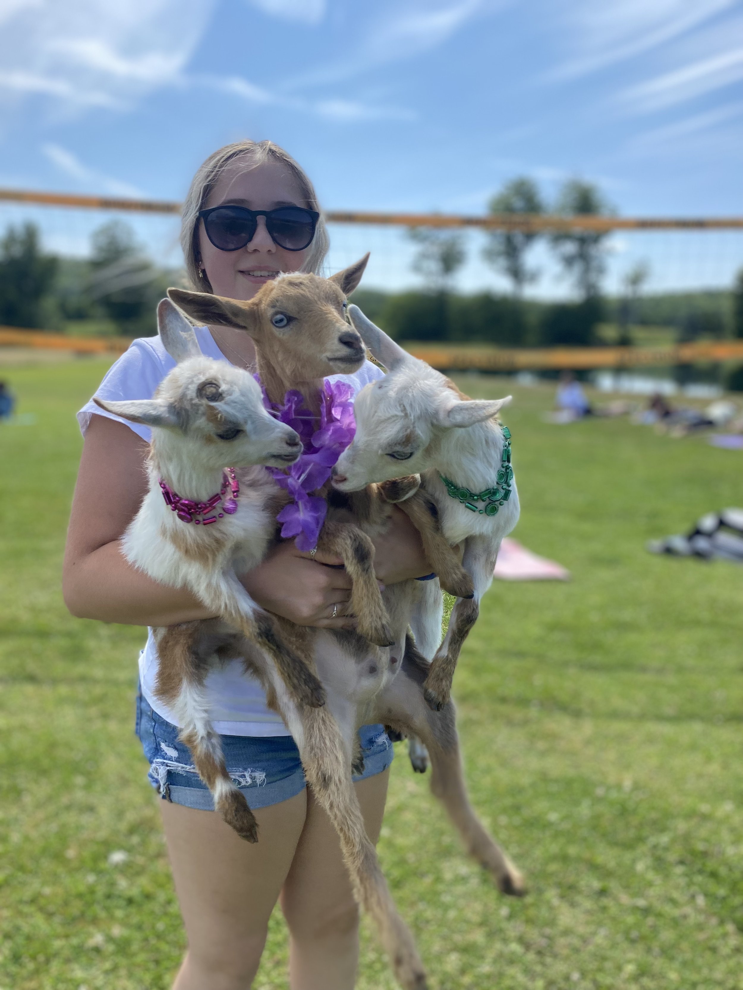 A farmer once joked: “If you can get a goat used to toddlers, you can get them used to yogis.” Kids of both species can be unpredictable, after all!